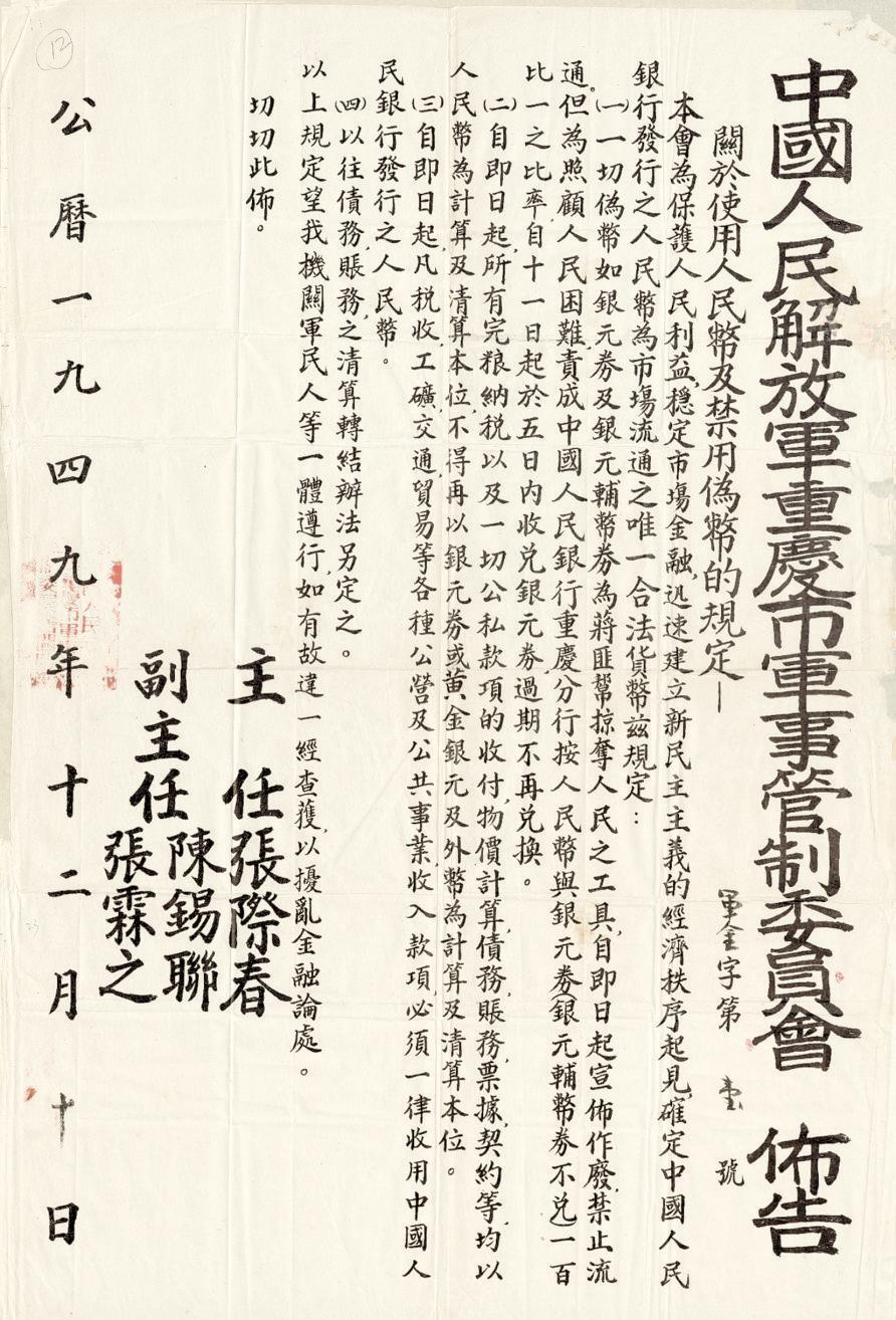 1949年12月10日,中国人民解放军重庆市军事管制委员会颁布的《关于使用人民币及禁用伪币的规定》布告。