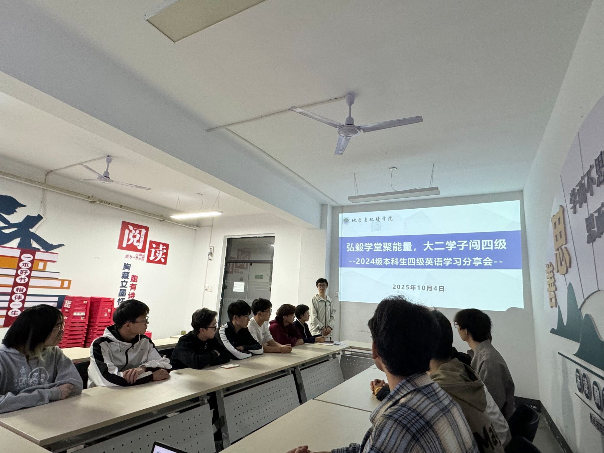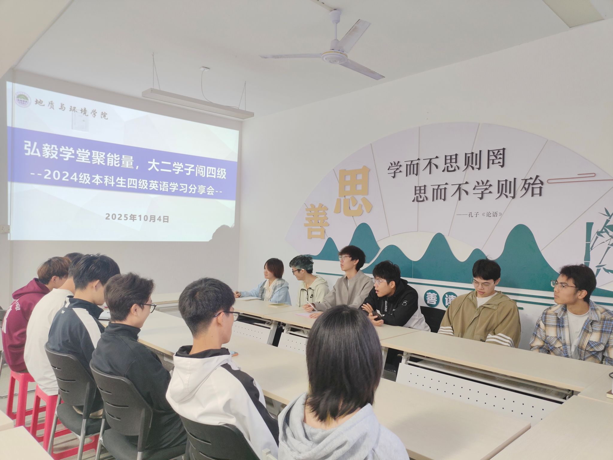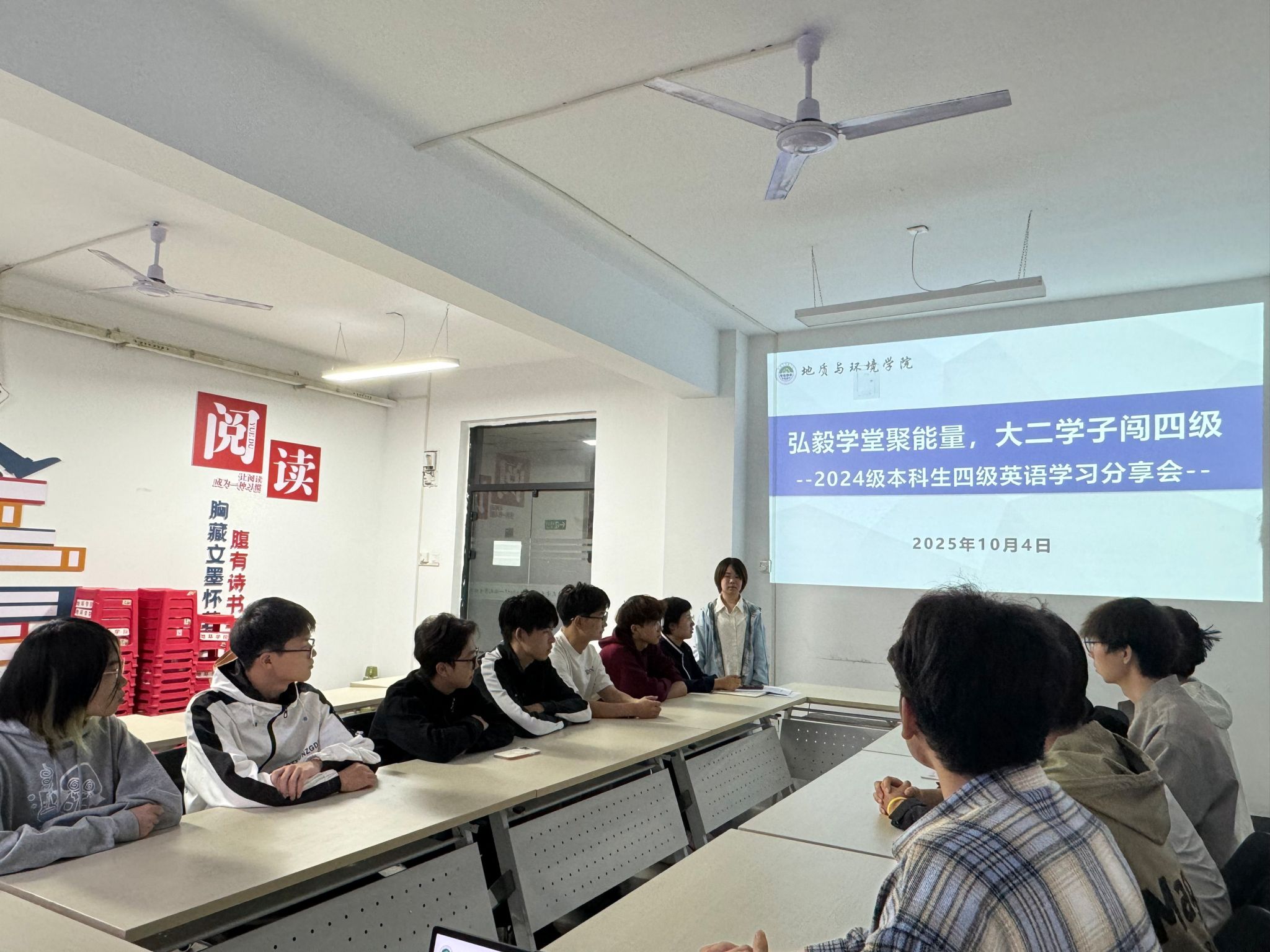10月4日下午,学院“弘毅学堂”之四级英语学习分享会,在“一站式”学生社区举办。地质工程(卓越)2301班杨浚熙、环境工程2303班晁晶晶两位同学现场分享“实战经验”,为学子送上针对性备考指导,学院学工办主任李琳参加了本次分享会。