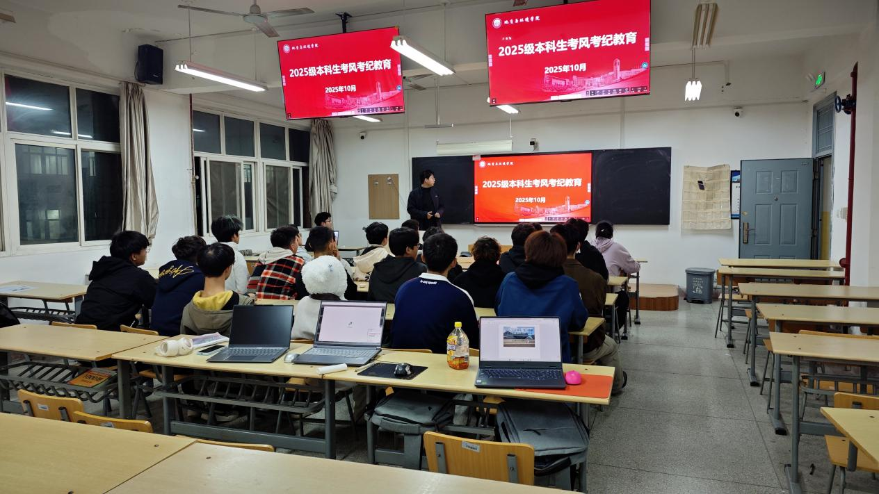 为营造公平、公正、诚实、守信的考试环境,进一步强化学风建设,引导学生树立正确的学习观和考试观,10月29日,学院召开2025级本科生考风考纪专题教育会。2025级辅导员周佳瑞主讲,全体2025级本科生参加会议。