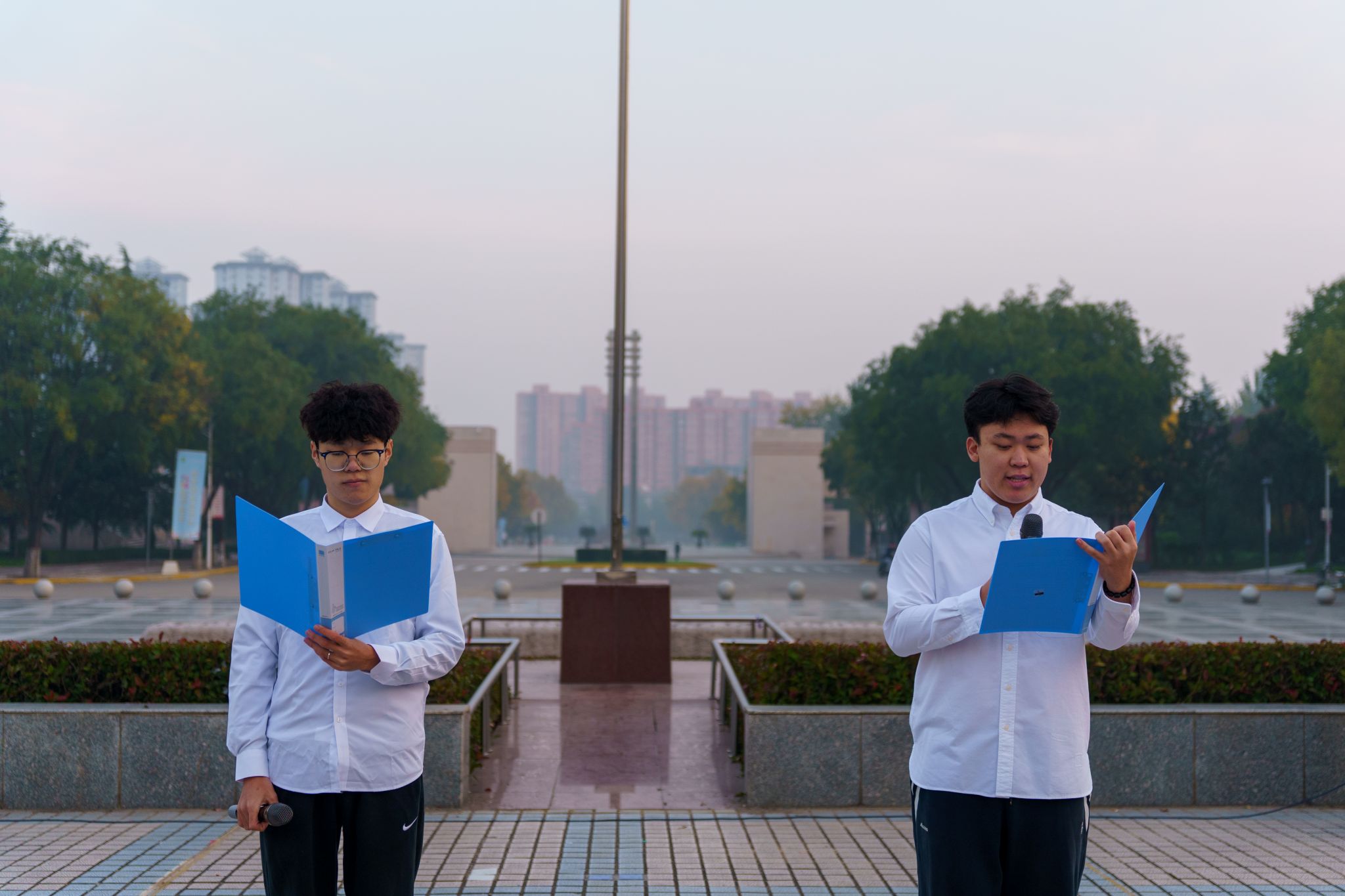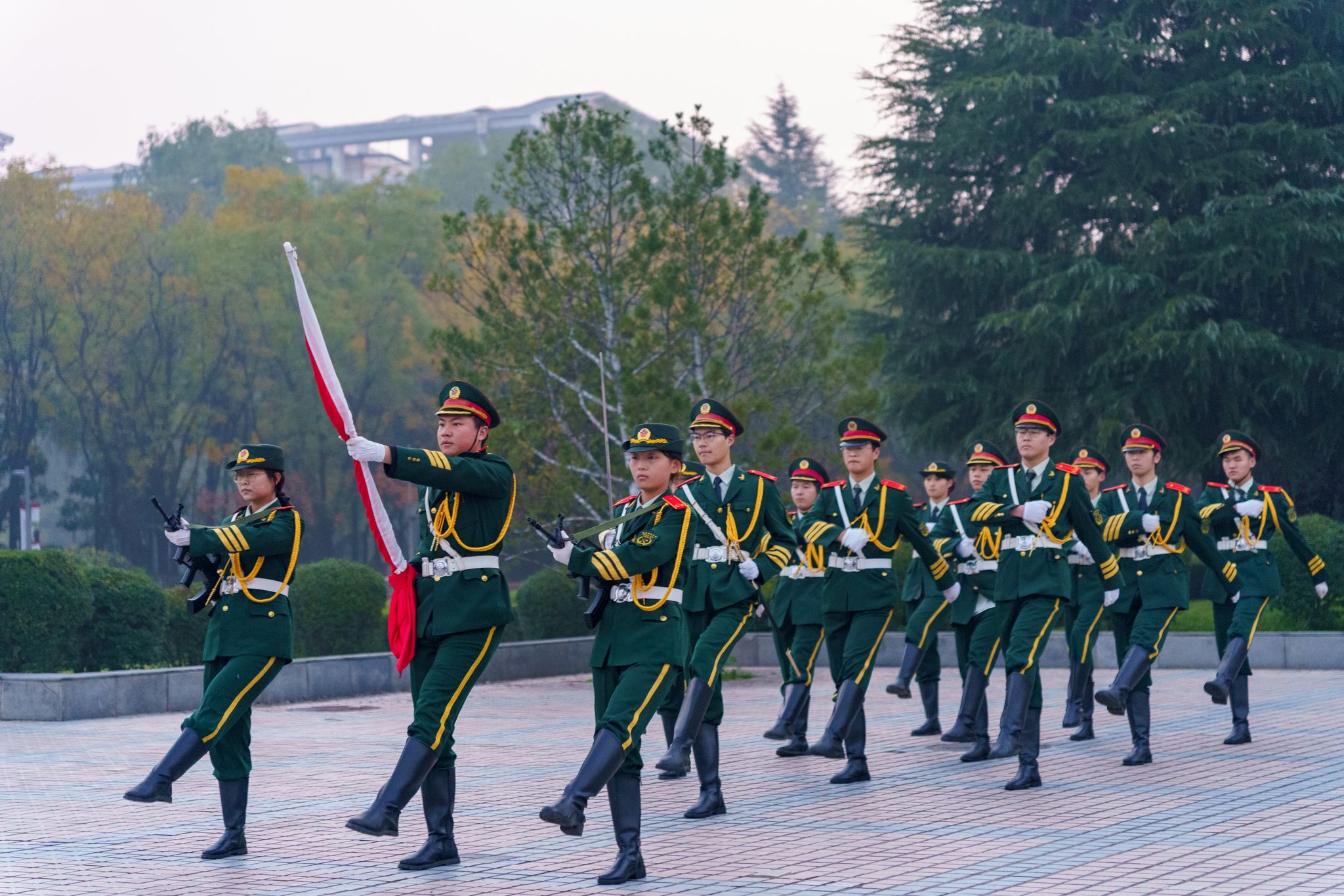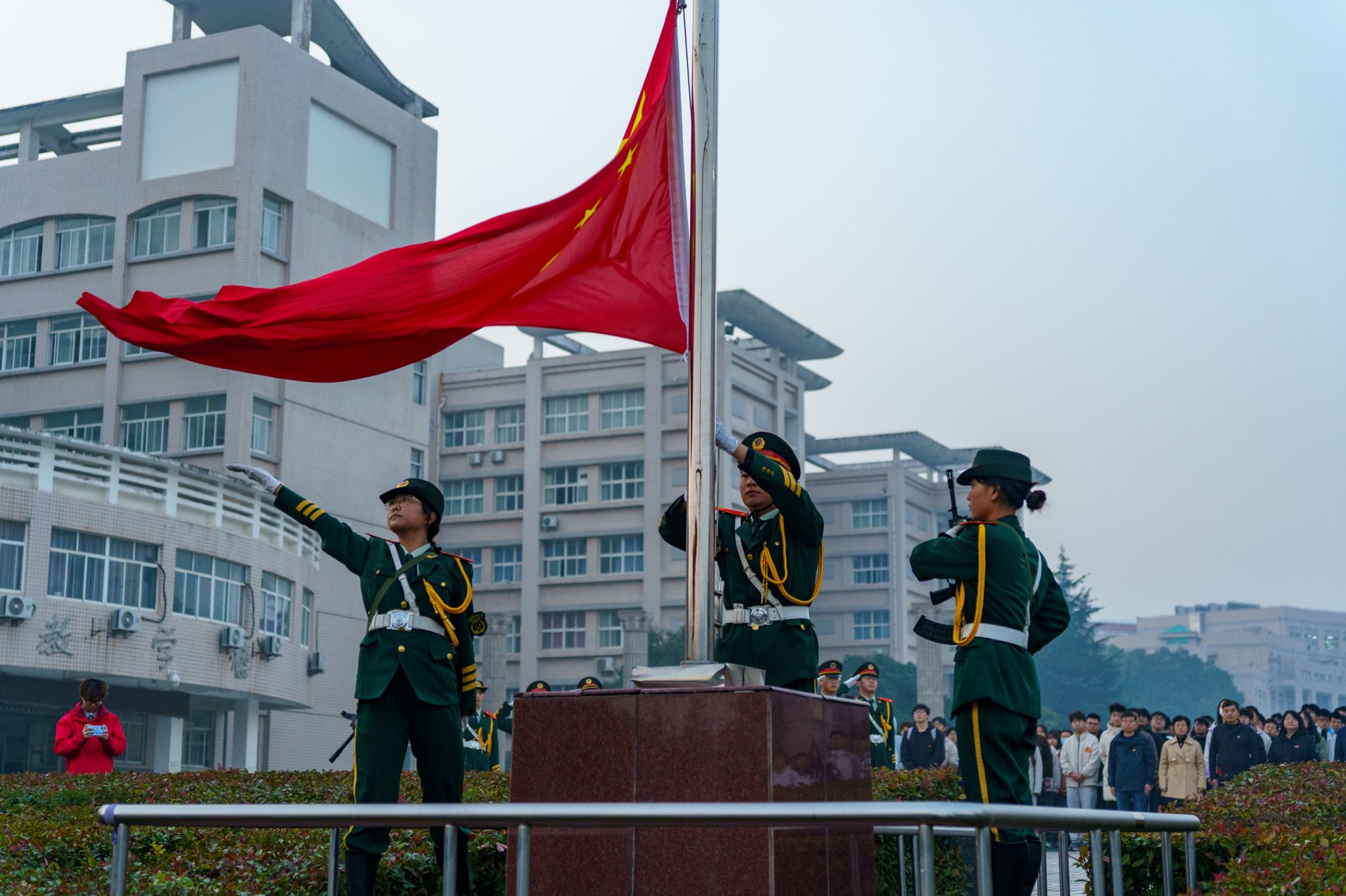 国旗护卫队队员身着整齐制服,身姿如松、英气勃发,迈着铿锵有力的正步迈入明德广场。雄壮的《义勇军进行曲》奏响,全体师生肃立高唱,嘹亮歌声回荡广场。五星红旗迎着晨光冉冉升起,师生们满怀崇敬行注目礼,目光追随着鲜红旗帜,眼眸中满是对祖国的赤诚与践行绿色使命的坚定信念。