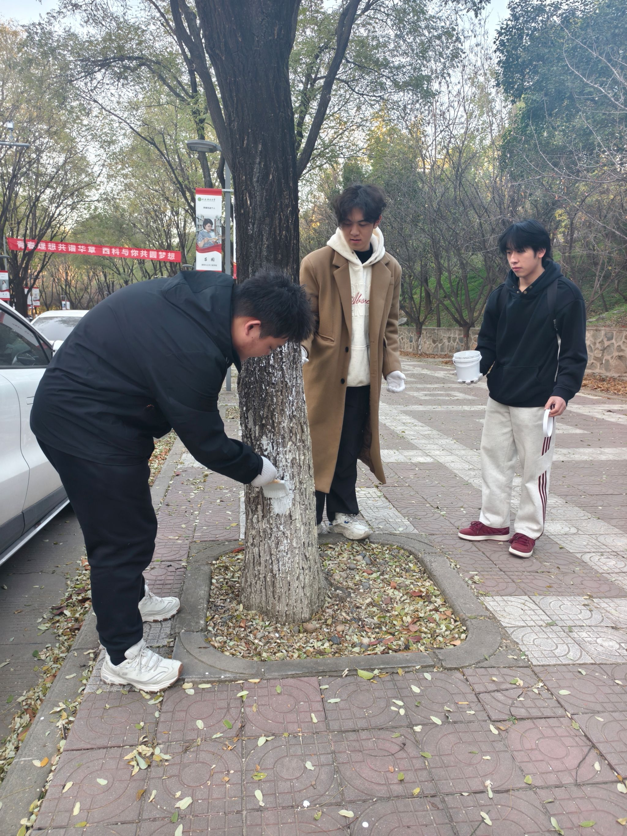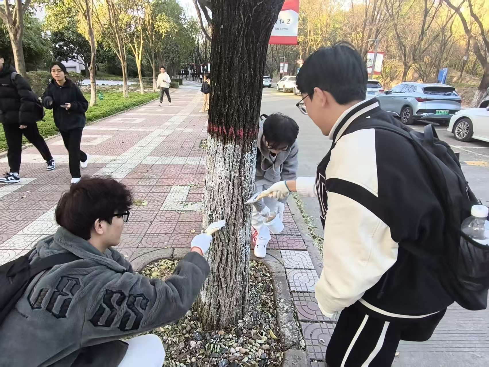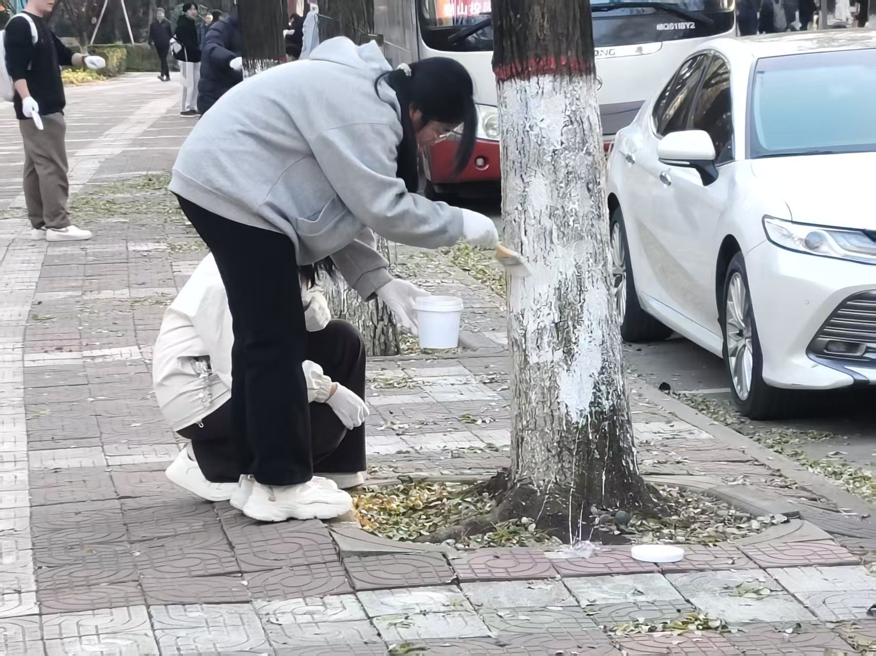 学院100多名同学齐聚明德广场,在工作人员明确涂白标准、安全规范后,迅速奔赴一号教学楼至图书馆后侧东环道作业区。大家分工协作,清理树干杂物、调配涂白剂、细致涂抹,动作规范有序。暖阳下,洁白的涂白剂沿着树干延展,为树木筑起抵御严寒与虫害的“防护盾”,劳动身影与校园景致相映成趣。