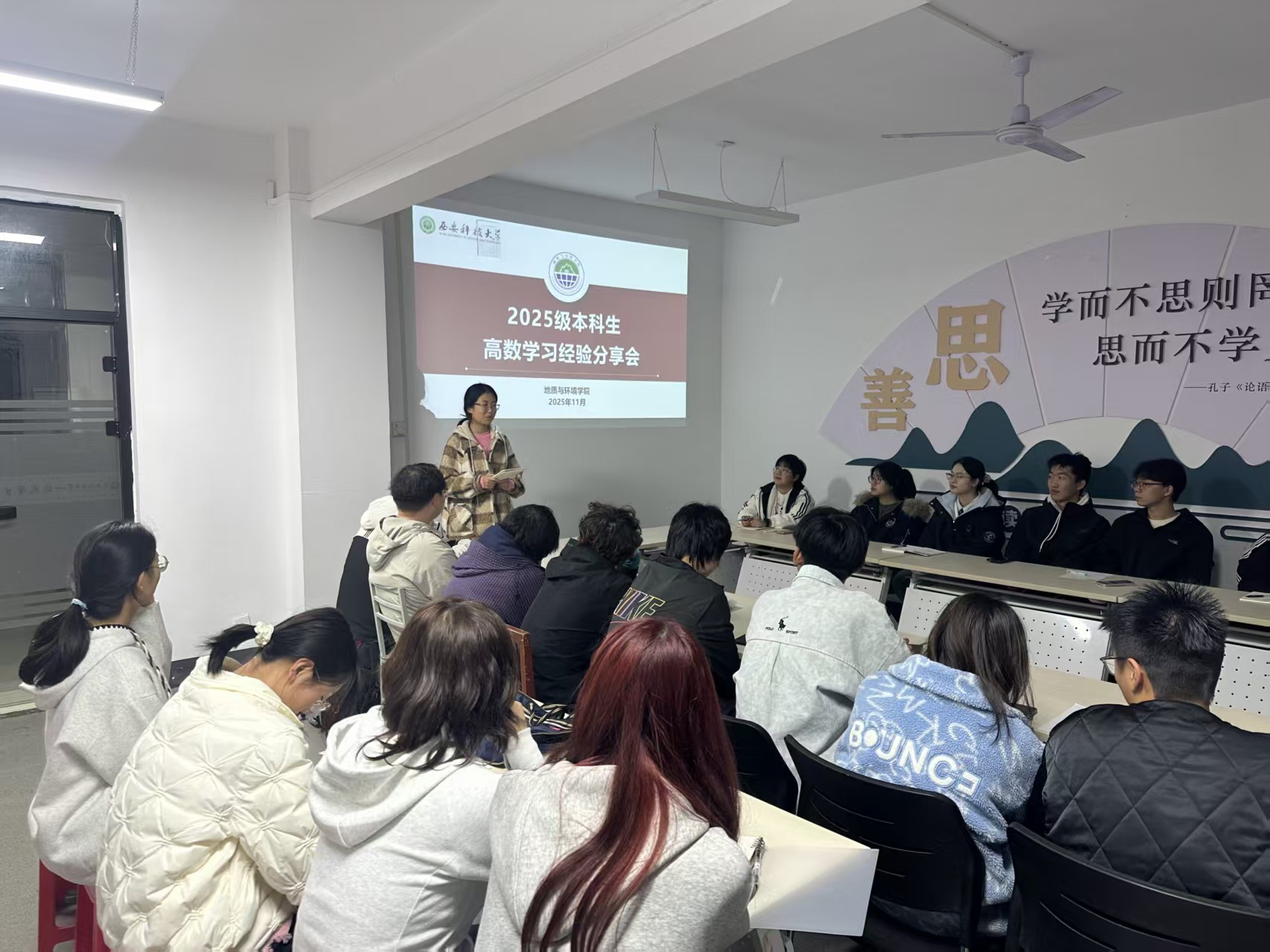 为营造严谨笃学、互促共进的优良学风,助力2025级新生攻克高等数学学习难点,掌握科学有效的学习方法,11月25日,学院于“一站式”学生社区举办了2025级高等数学学习经验分享会。本次分享会特邀在近期章节测试中取得优异成绩的2025级学生代表高雪棋、程可心、夏宇龙、韩贝、韩梓萌担任主讲,2025级辅导员周佳瑞主持,2025级学生代表参会。
