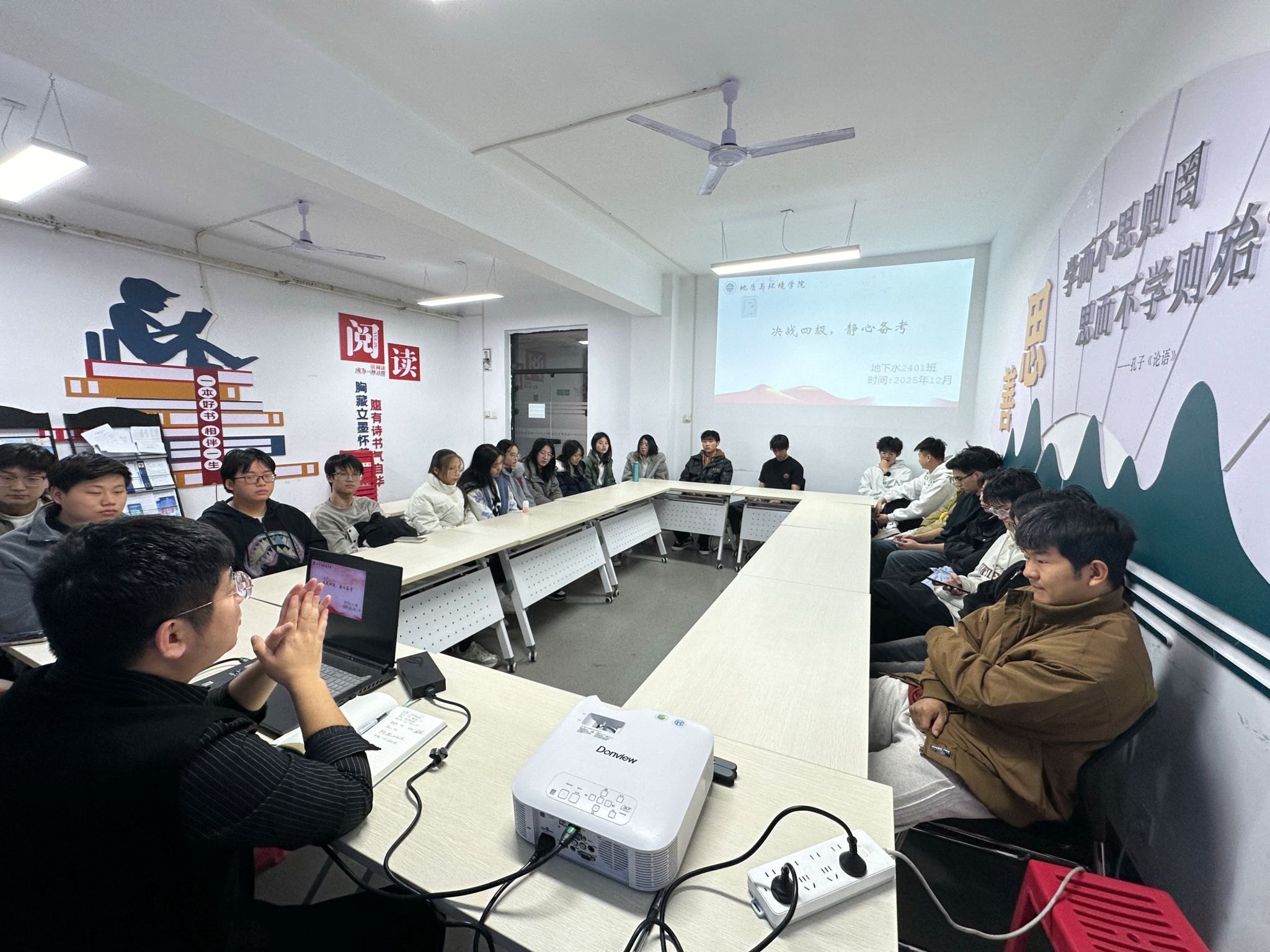 为帮助同学们梳理四级应试与期末复习思路、攻克难点,同时迎接期末考试、营造全员奋进的备考氛围,12月1日,地下水科学与工程2401班在“一站式”学生社区举办了“决战四级,静心备考”主题班会。班主任马稚桐主持班会,全体同学参会。