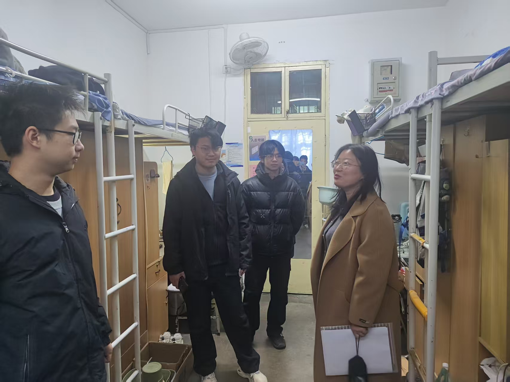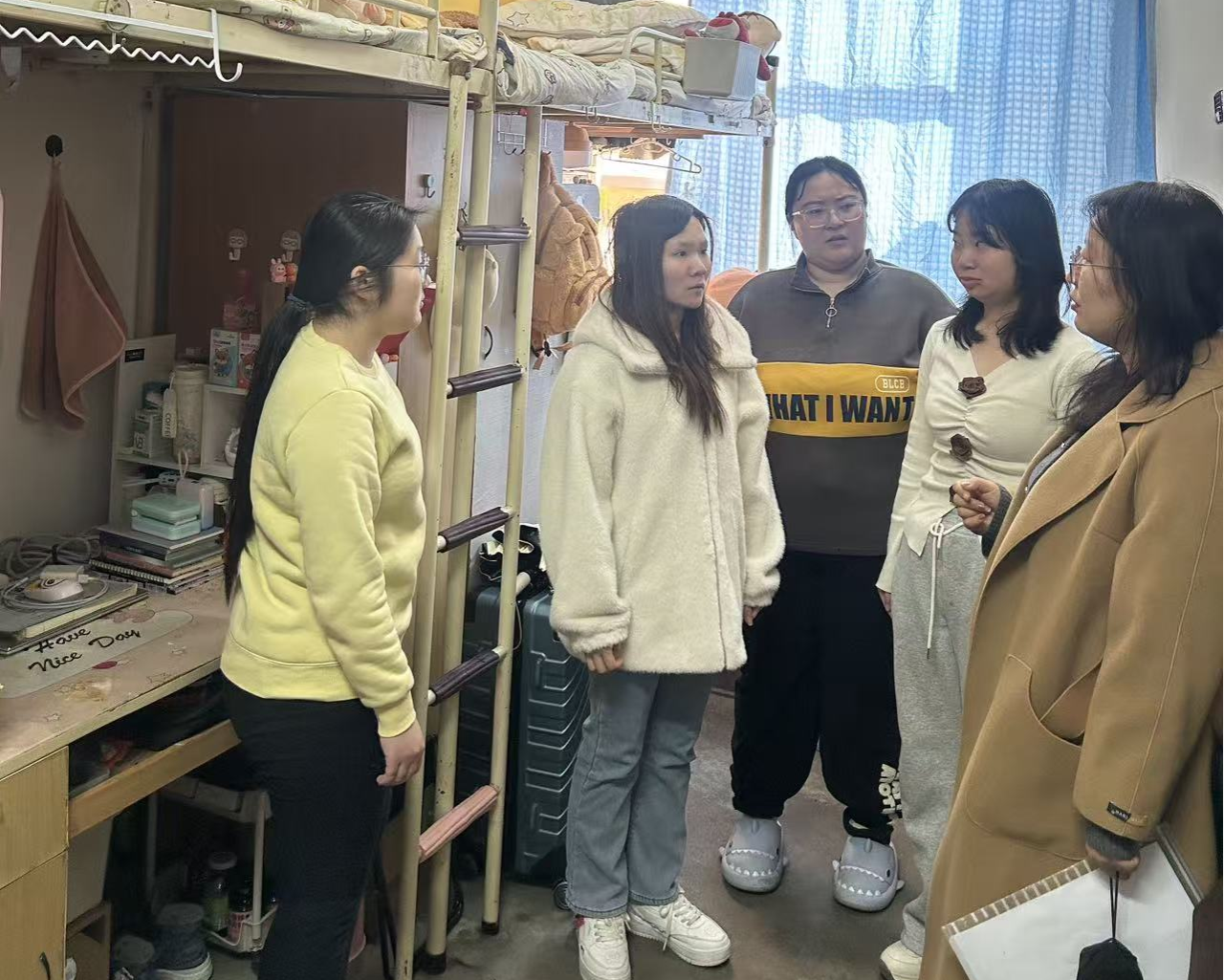 会后,韩蕊带领学生干部逐一走访2023级学生宿舍开展专项检查及安全教育。重点排查违规插排、大功率电器、私拉电线等安全隐患,对排查出的问题现场督促整改;向同学们演示火灾逃生正确步骤,重申假期宿舍断电、门窗锁闭等安全注意事项;强调提高对网络诈骗的防范意识,提醒离校同学妥善保管个人财物、规划安全行程,留校同学严格遵守公寓管理规定、杜绝夜不归宿。此外,还提醒同学们提前做好离校或留校安排,确保假期期间通信畅通,遇突发情况第一时间联系辅导员。