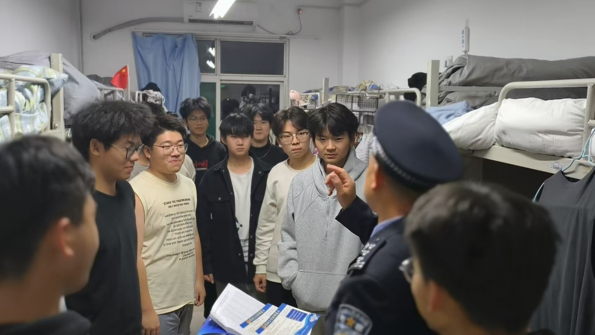 活动第二阶段,学院党委副书记刘训明、全体辅导员与民警一同深入学生宿舍,开展“一站式”社区面对面反诈宣传。他们走进学生中间,亲切询问同学们日常网络消费、社交软件使用等情况,结合不同年级学生的生活学习特点进行针对性提醒,告诫大家务必警惕不明链接、虚假兼职广告、冒充熟人借款等常见陷阱。宣传人员还现场发放了反诈宣传单,并耐心指导同学们下载、注册和正确使用“国家反诈中心”APP,详细讲解其来电预警、风险查询、线索举报等实用功能,确保反诈工具落到实处、发挥实效。