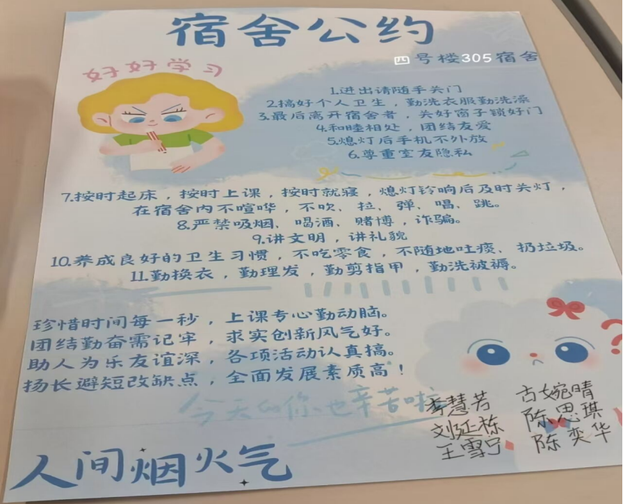 活动期间,各宿舍结合自身实际,围绕作息协调、卫生维护、矛盾沟通、学业互助等核心议题充分交流。从夜间轻声不扰眠到情绪低落互陪伴,从尊重差异多包容到定期谈心解心结,同学们立足心理需求与集体利益平等协商,将尊重、理解、支持等心理成长理念融入公约条款。参与同学表示:“一起讨论制定公约,让我们更懂彼此的想法。”通过坦诚沟通,化解了平时相处中的潜在隔阂,不仅建立了“宿舍是家”的归属感,更学会了如何在集体中关照他人情绪、调节自身心态。