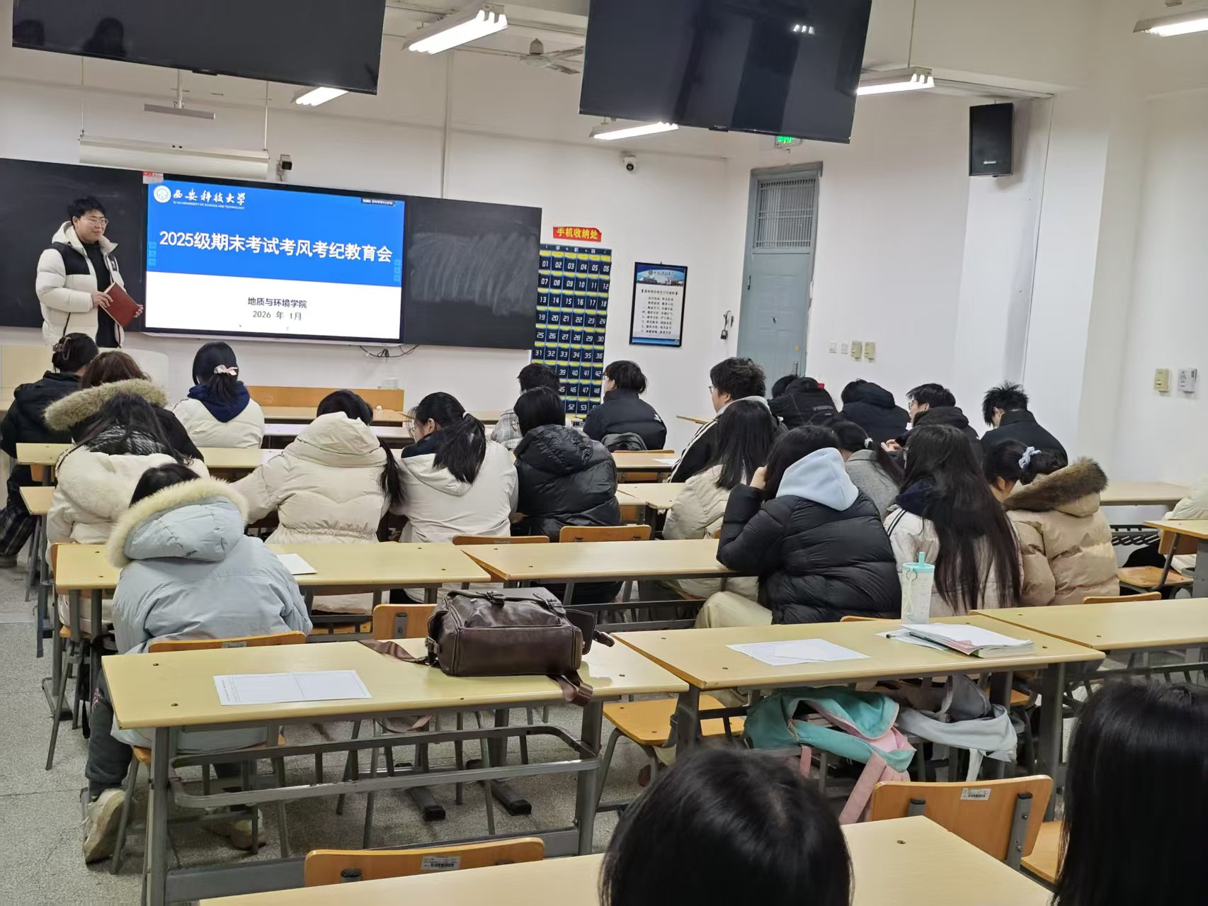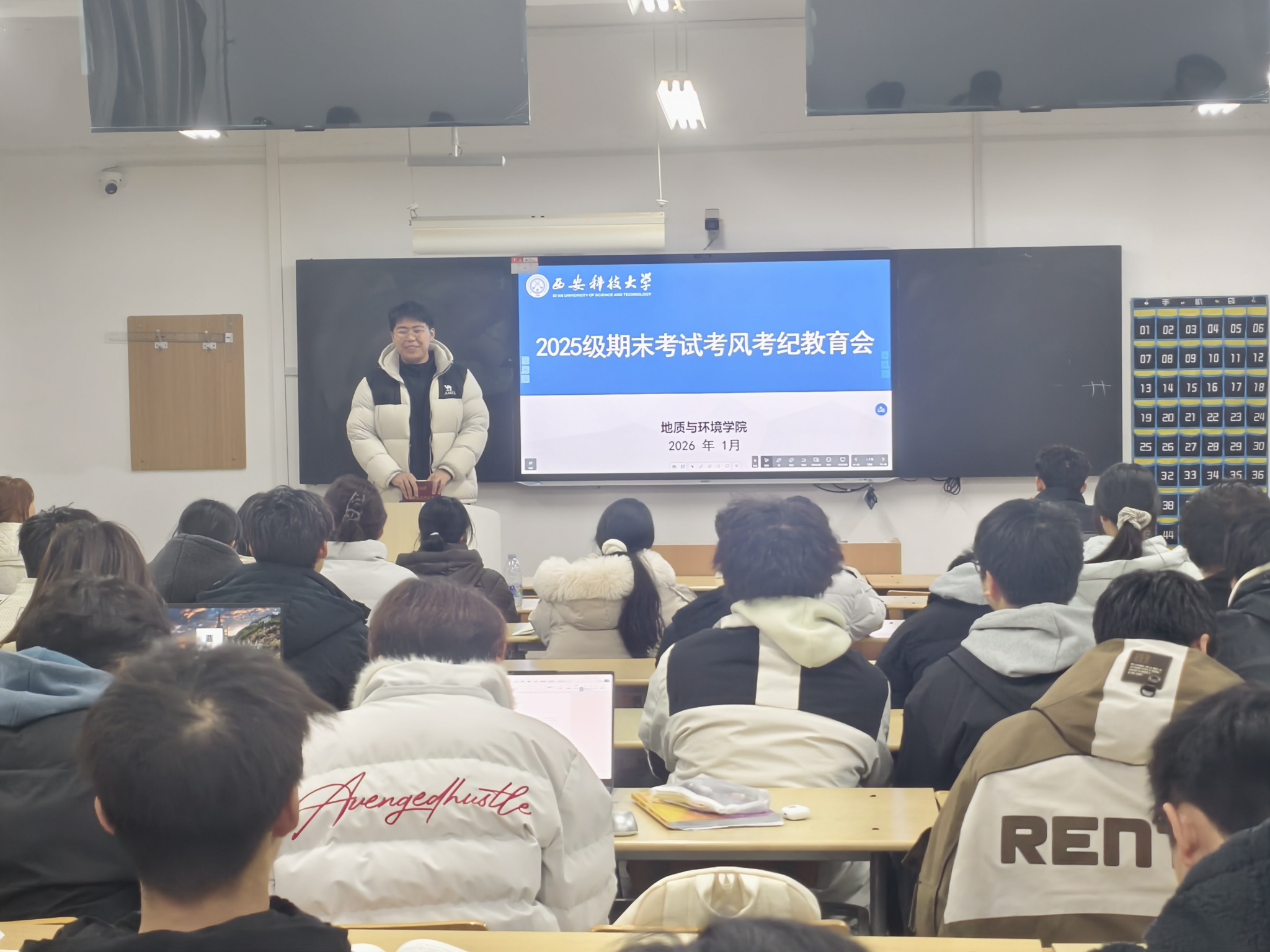 为加强学风建设,严肃考风考纪,营造公平、公正、诚信的考试氛围,确保2025-2026学年第一学期期末考试工作顺利进行,2026年1月4日,学院组织召开2025级本科生期末考试考风考纪专题教育大会。会议由学院2025级本科生辅导员周佳瑞主持,2025级全体学生参加。