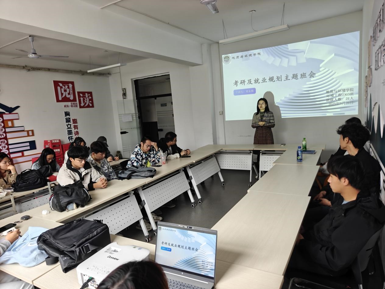 班会伊始,刘永娟老师首先关切询问了同学们近期的学习进度与生活状态,着重强调大三学年是学业进阶与发展选择的关键节点,考研、就业等发展方向的规划已成为当前阶段的核心重点。为精准掌握每位同学的发展诉求,刘老师逐一与同学们交流沟通,针对不同选择的同学开展靶向指导:对于有考研意向的同学,她从目标院校筛选、专业匹配度分析、备考节奏规划等方面给出具体建议,助力同学们明确备考方向;对于计划就业的同学,她详细介绍了多家与环境工程专业紧密相关的优质企业及岗位需求,鼓励大家提前对接实习资源,积累实践经验,提升就业竞争力。