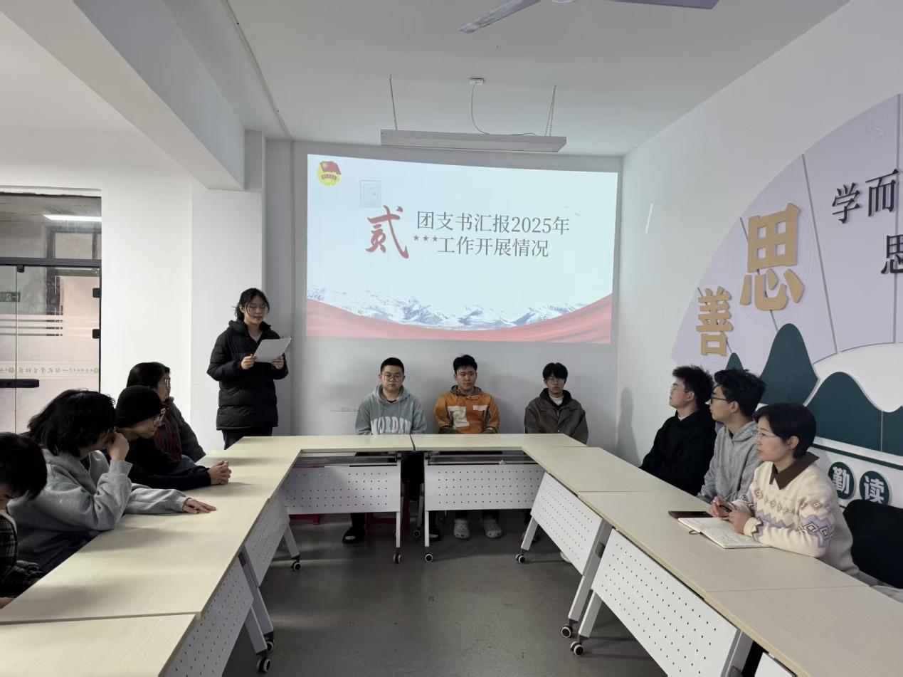会议紧扣主题、按规范流程有序推进。伊始,全体团员起立齐唱团歌《光荣啊,中国共青团》,嘹亮的歌声凝聚起青春奋进的力量。随后,大家集体学习国家主席习近平二〇二六年新年贺词,从贺词中汲取奋斗动能、筑牢思想根基。团支书张鑫宇作年度工作报告,全面梳理成效、查摆不足,明确了下一阶段工作方向。