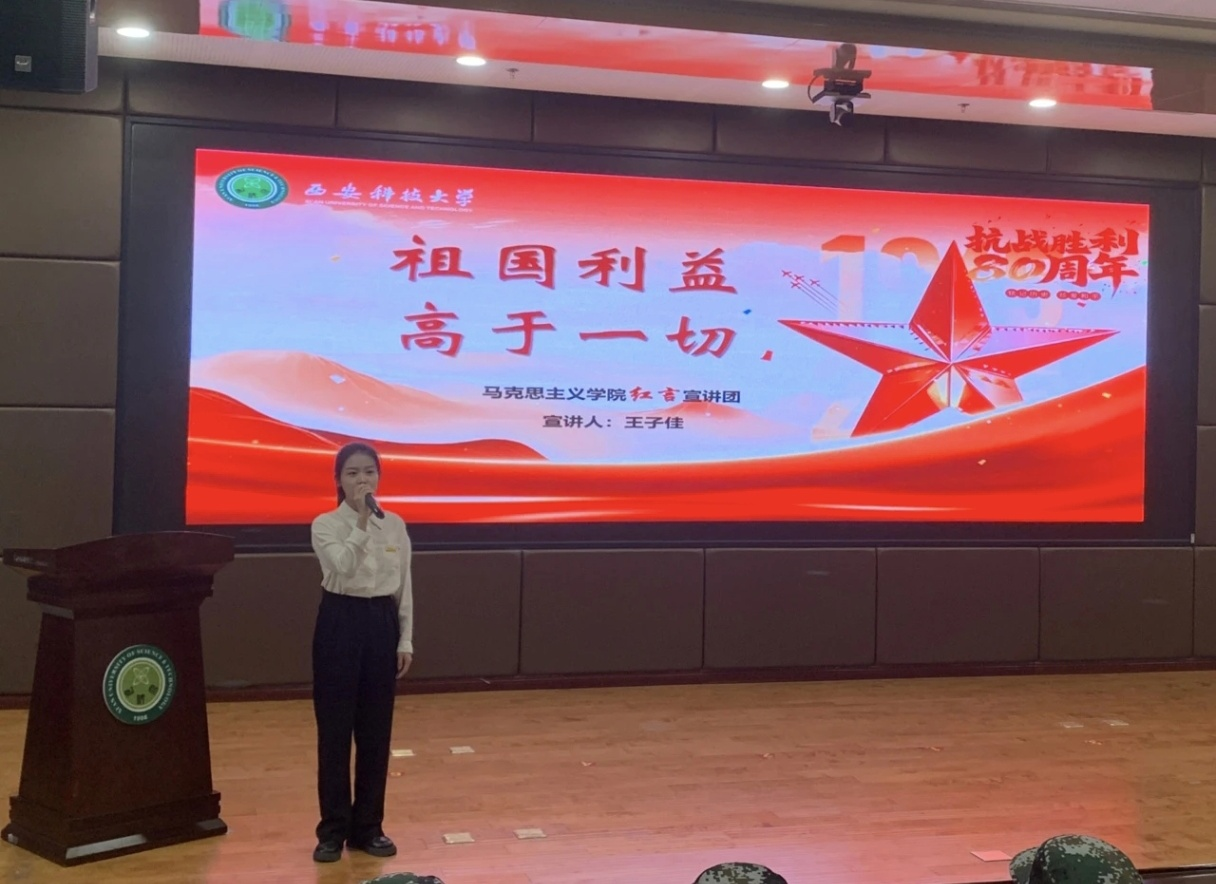 宣讲伊始,红言宣讲团成员王子佳以“祖国利益高于一切”为主题,围绕抗日战争中涌现的英雄人物和感人事迹展开讲述。她通过杨靖宇、赵尚志等抗日英雄坚守信念、不畏牺牲的真实故事,深刻阐释了“祖国利益高于一切”的精神内涵,并号召广大青年学子在新时代继续弘扬这一崇高信念,勇担使命、奋发有为。宣讲情感真挚、内容详实,引发了同学们的广泛共鸣。